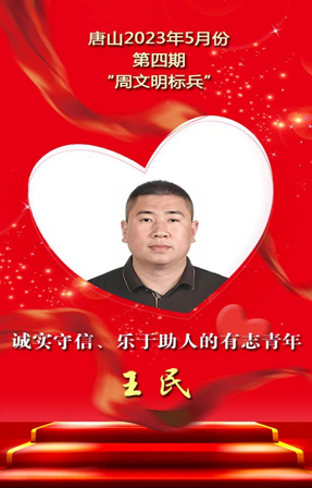 日前,唐山市“文明標(biāo)兵”評(píng)選發(fā)布組委會(huì)辦公室公布了20235月份第四期“周文明標(biāo)兵”名單。他們是: